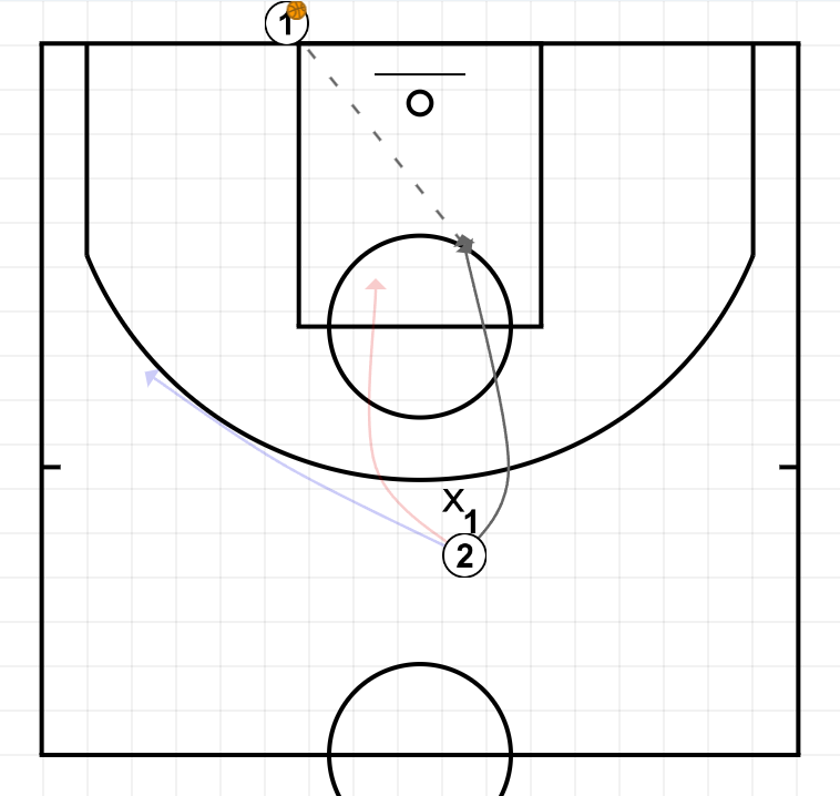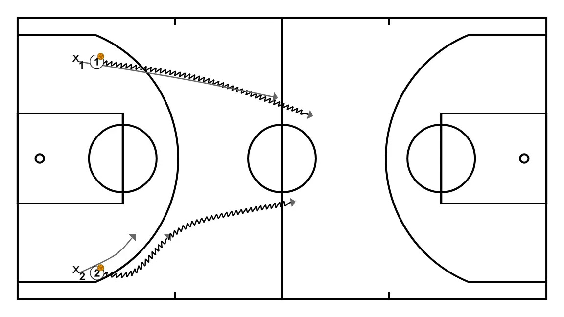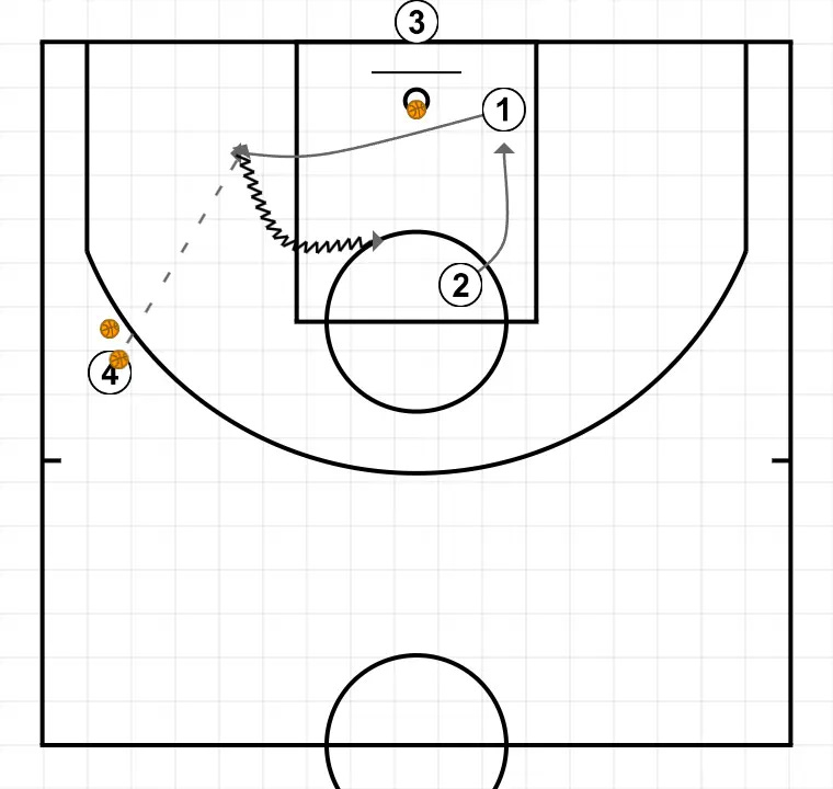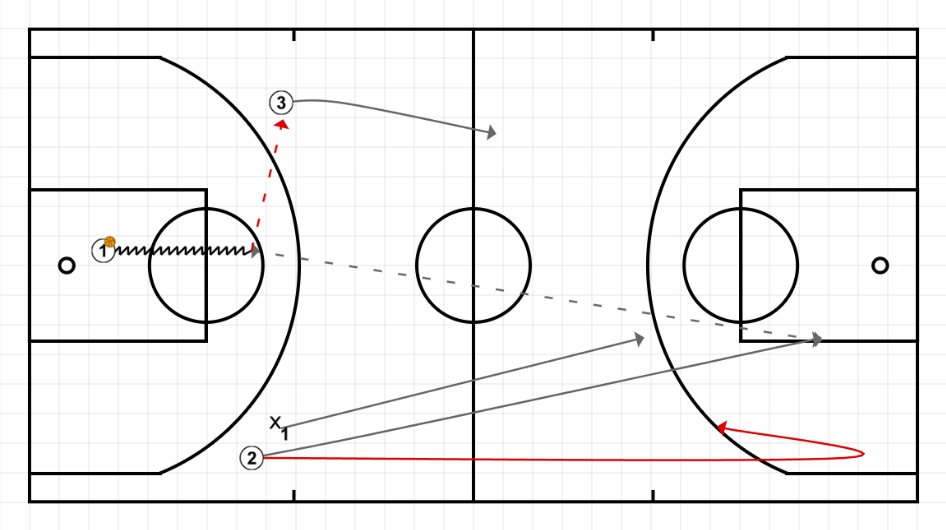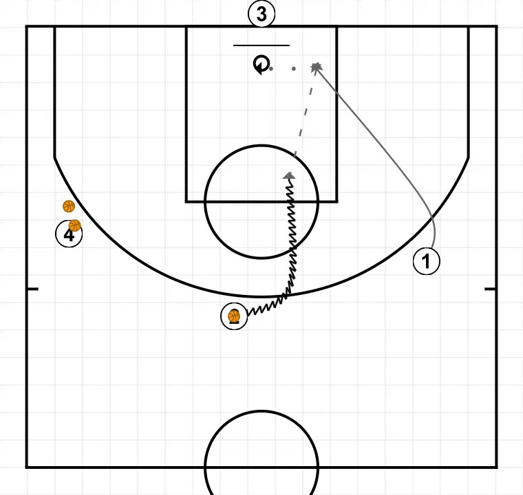 Se juegan tres 2c0 consecutivos con los conceptos planteados en las situaciones 10 y 11. Una vez se ha tirado a canasta, el jugador del fondo lo recoge el balón y los dos atacantes reciben un nuevo pase de (4) para seguir jugando el 2c0.