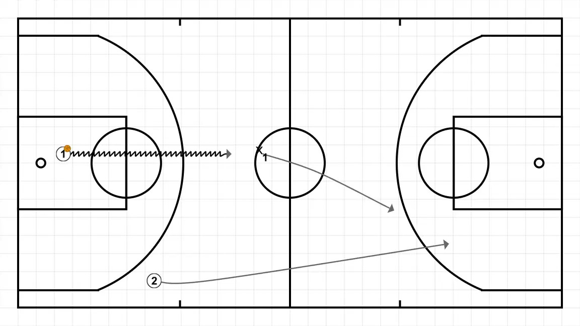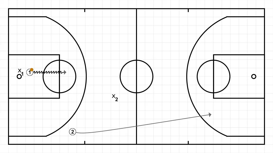 Si defiende a (2), salida con bote avanzado. Si defiende a (1), pase de inicio de contraataque.