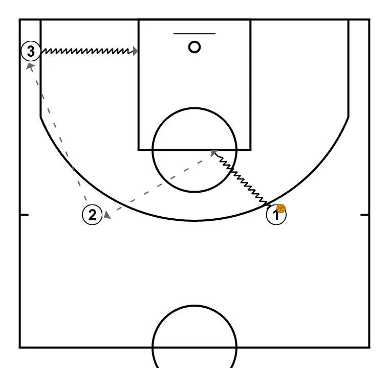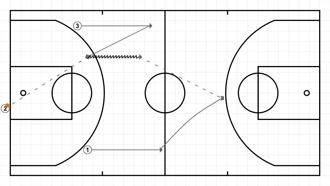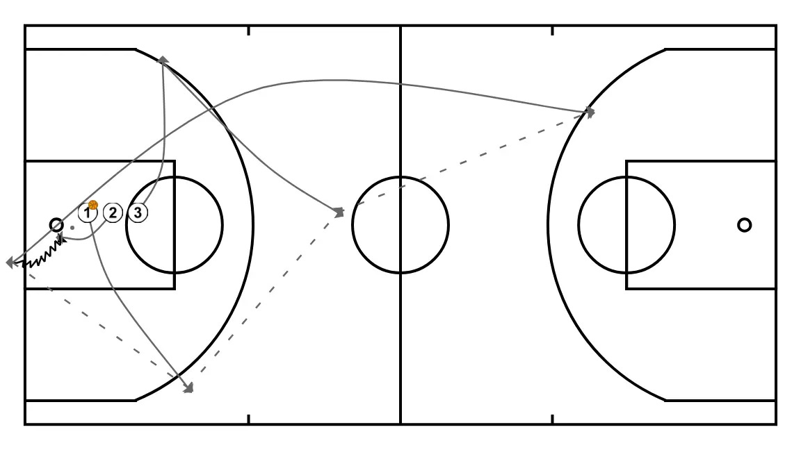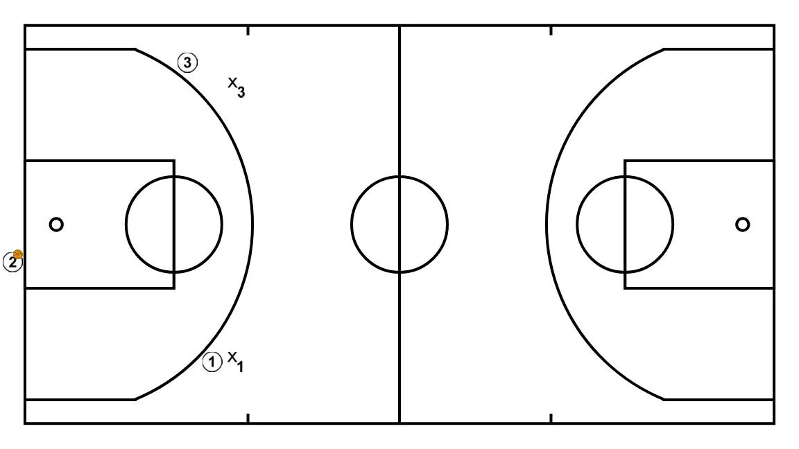 Iniciamos con un jugador que tira a tablero para rebote y tiro del segundo jugador. Si anota se saca de fondo para empezar a jugar el 3c0.
