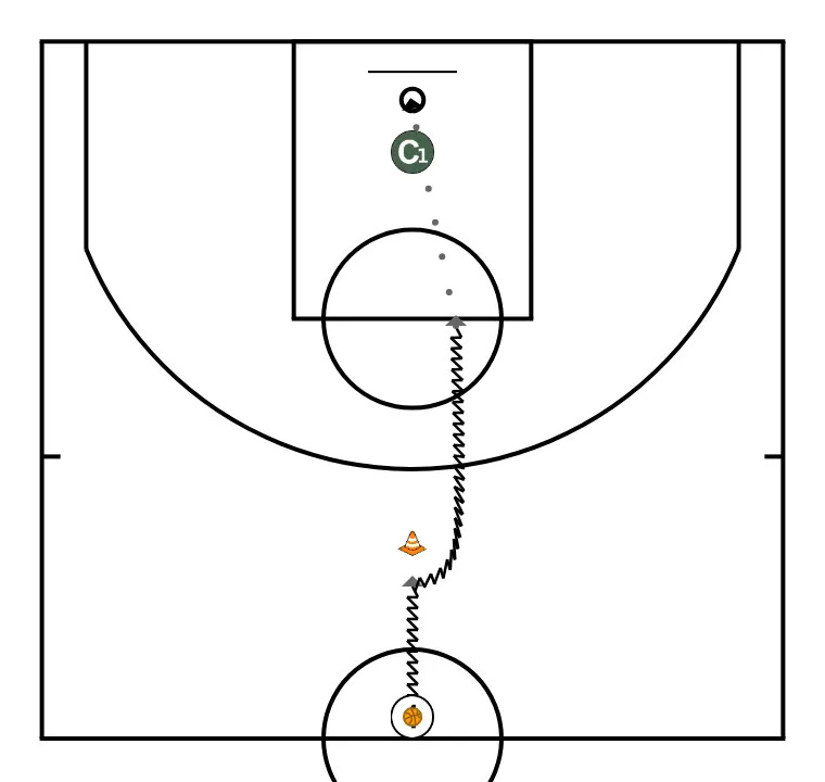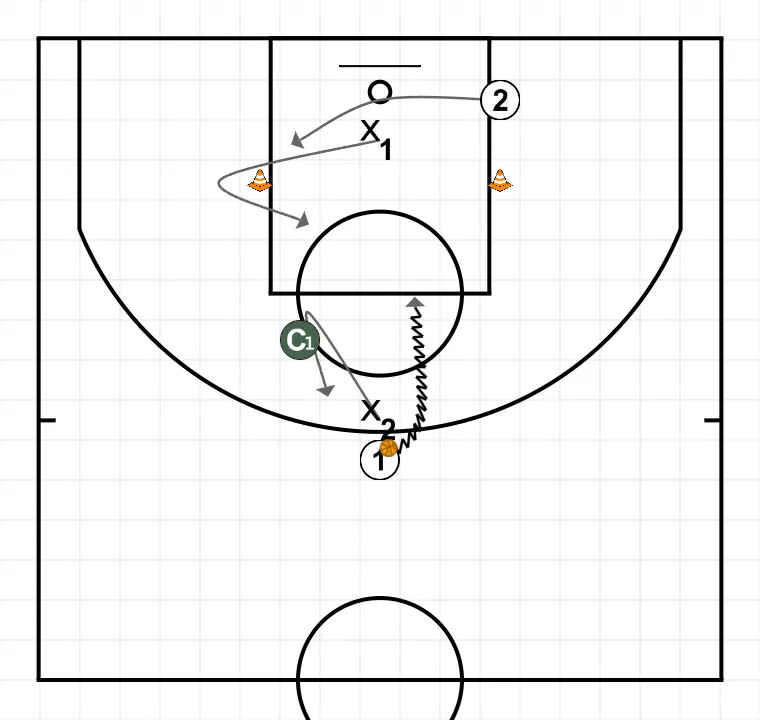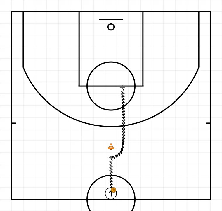 Añadimos más elementos de toma de decisión, simulando situación de closeout. Atacar el pie avanzado del defensor. Si el defensor no avanza ningún pie, tirar.