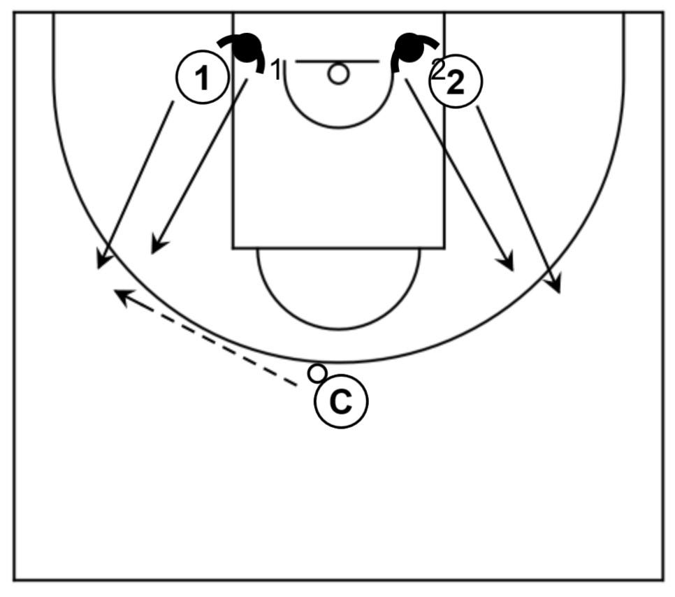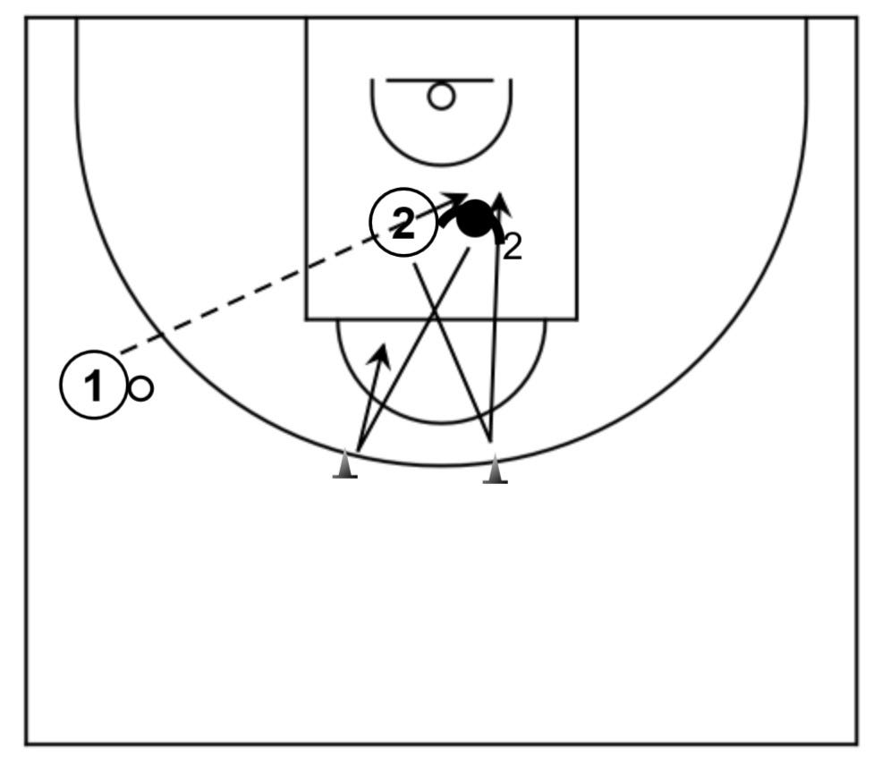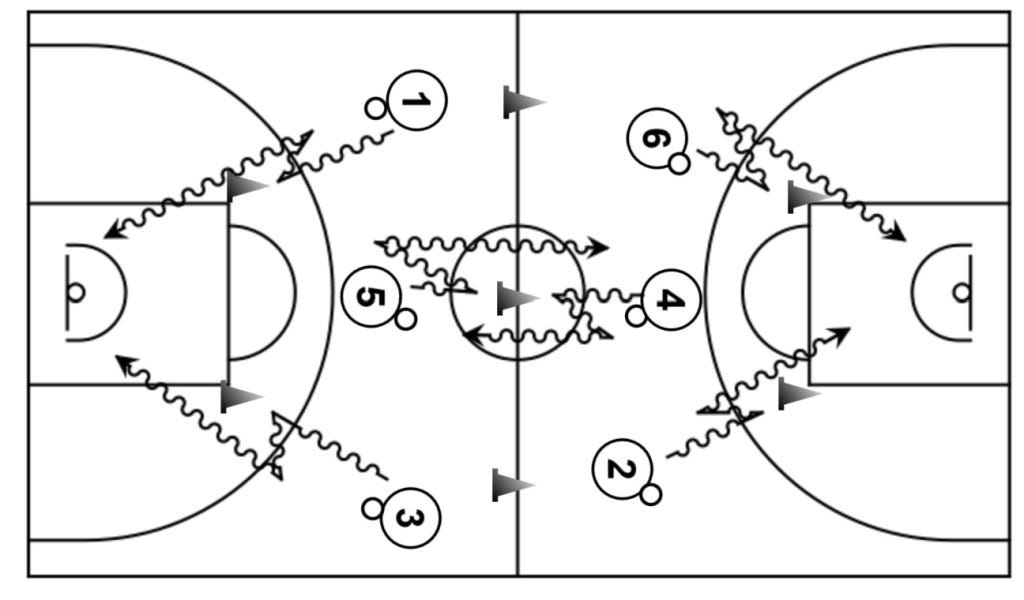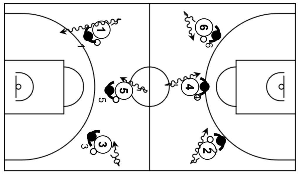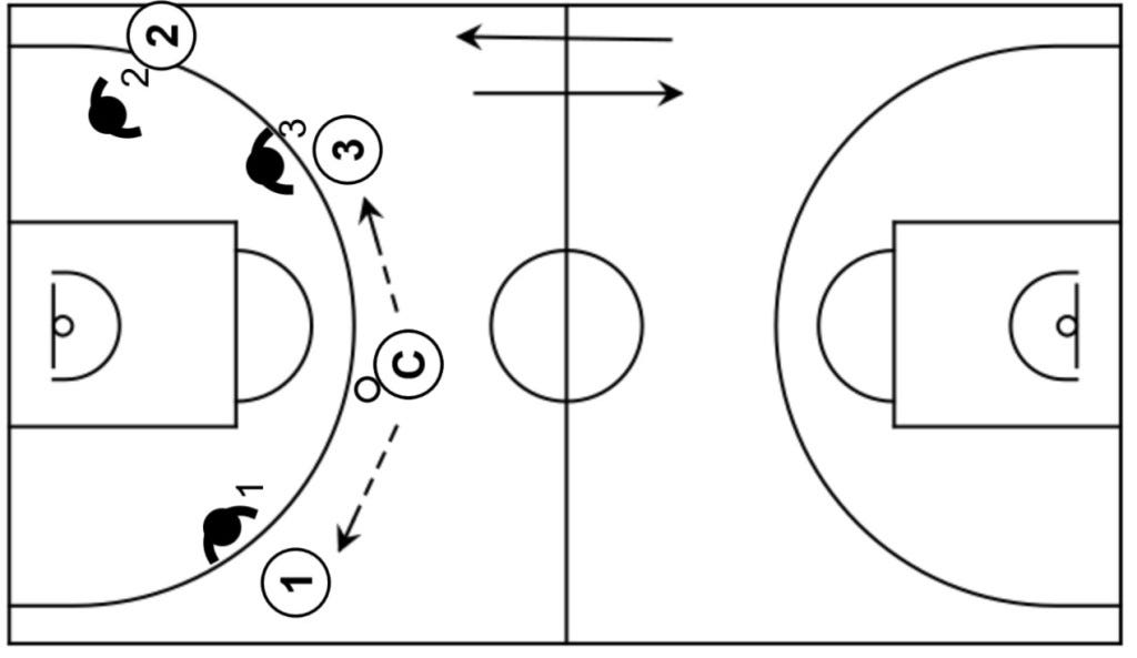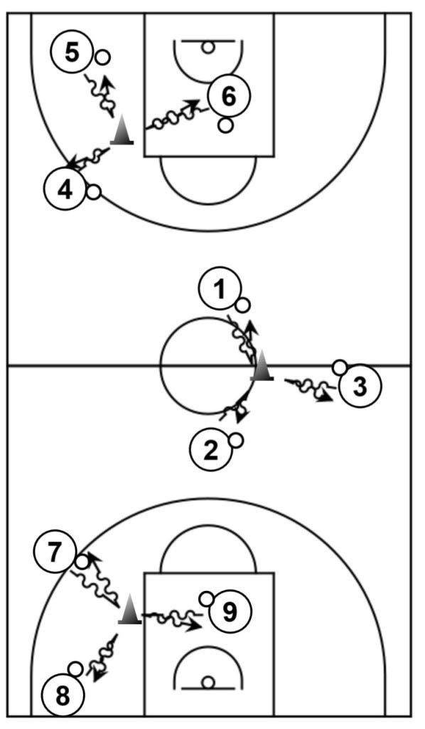 Jugar situación de 2c2 sobre recepción en una canasta para acabar jugando situación de contraataque en la otra.