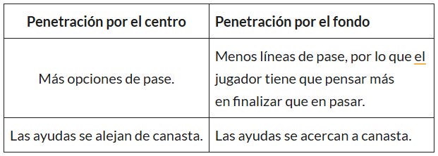 Jugando dentro- fuera con el jugador interior: La defensa se cierra sobre el jugador interior y al volver a pasar al exterior se genera situación de 1c1.