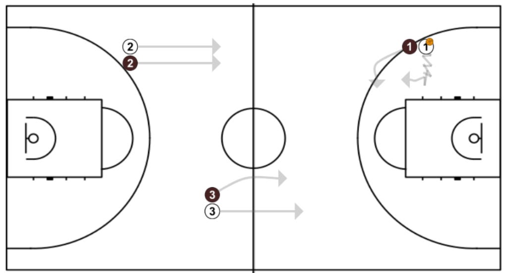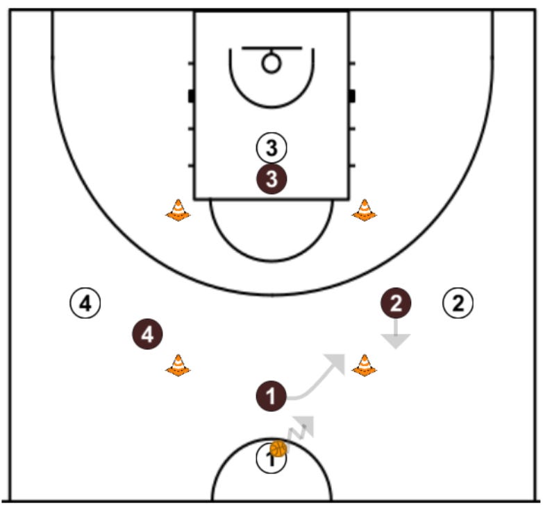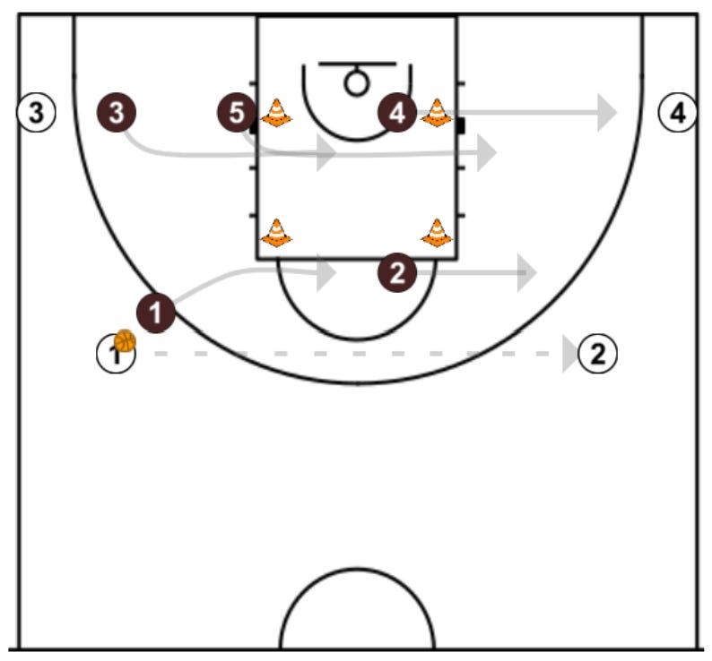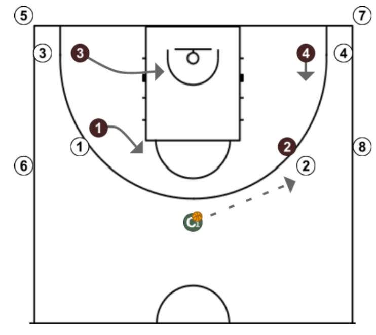 Rotación: quien entra siempre ataca. Quien no coge el rebote o recupera el balón, sigue defendiendo.