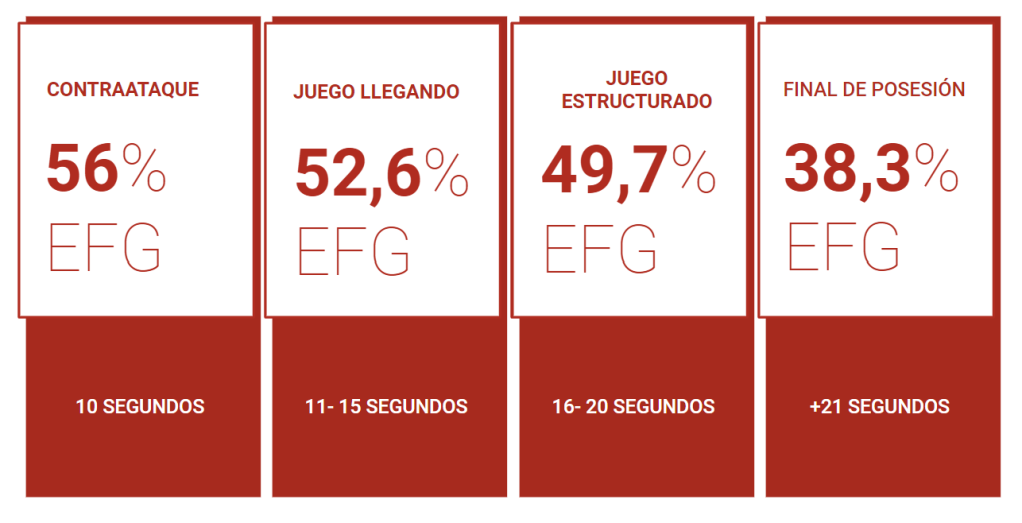 Según estas estadísticas de partidos de la NBA, cuanto antes se genera un buen tiro, más eficiencia se consigue. Él lo atribuye, entre otras cosas, a que el campo que se está aprovechando para jugar es más grande, por ejemplo, en un contraataque (todo el campo) que en un final de posesión (¿cuarto de pista?).