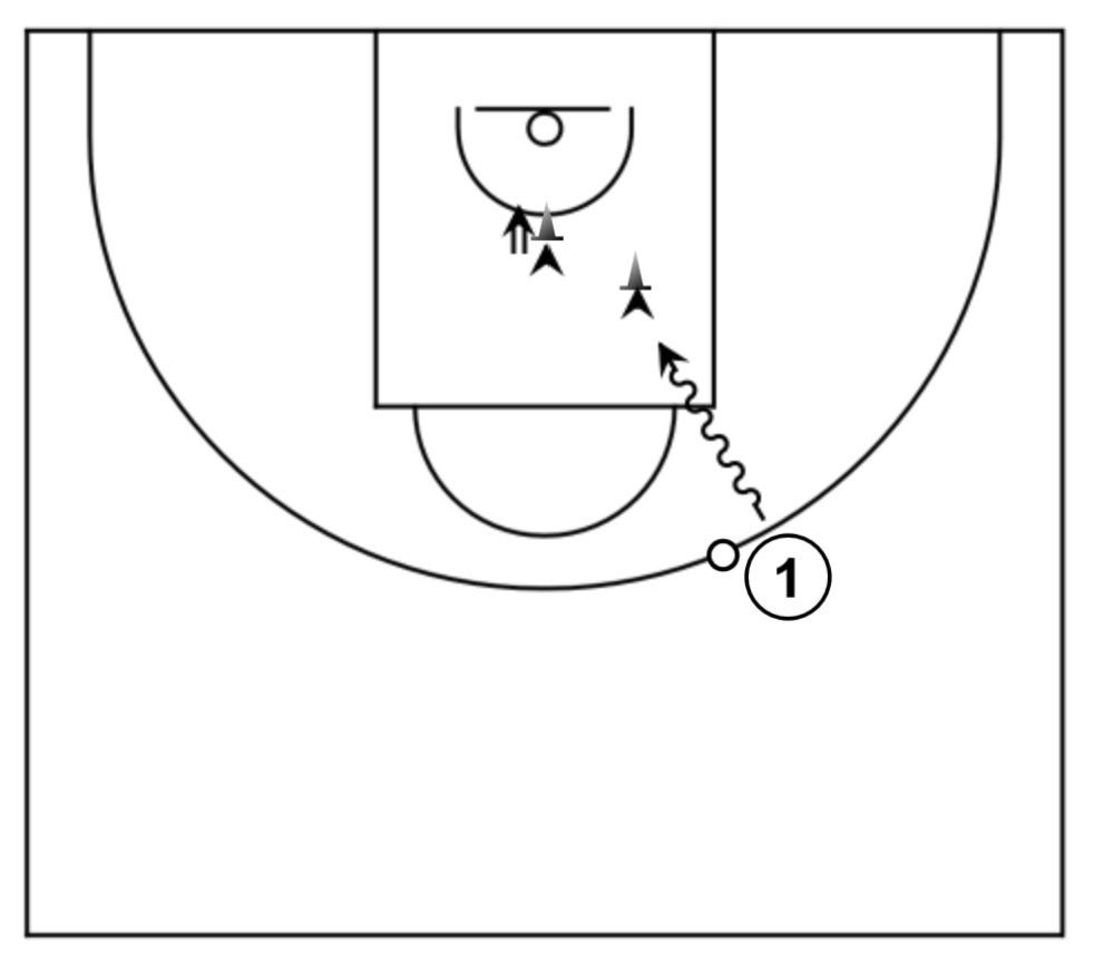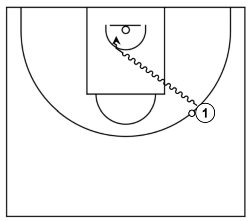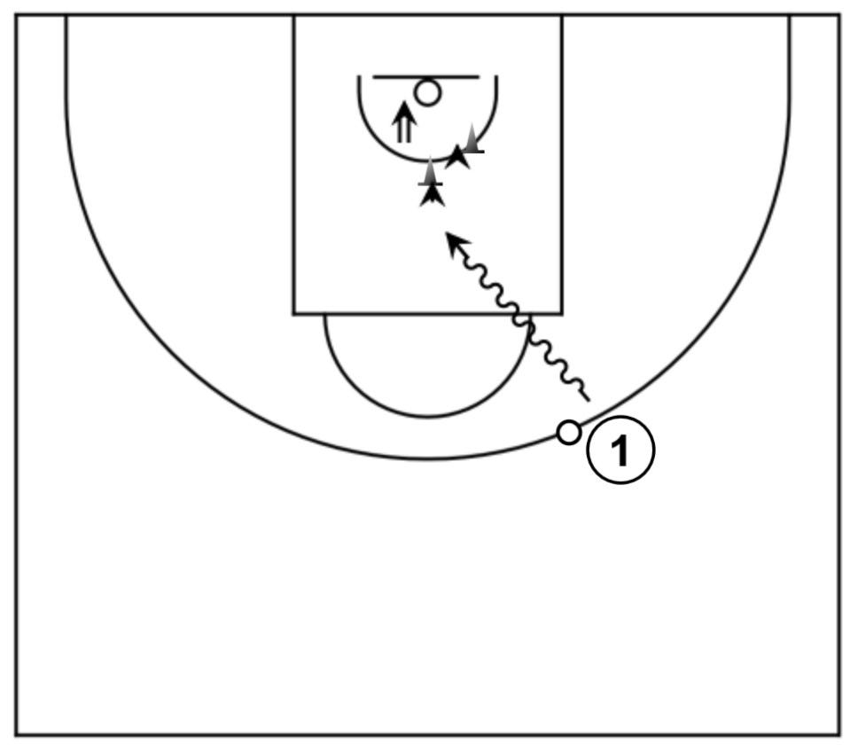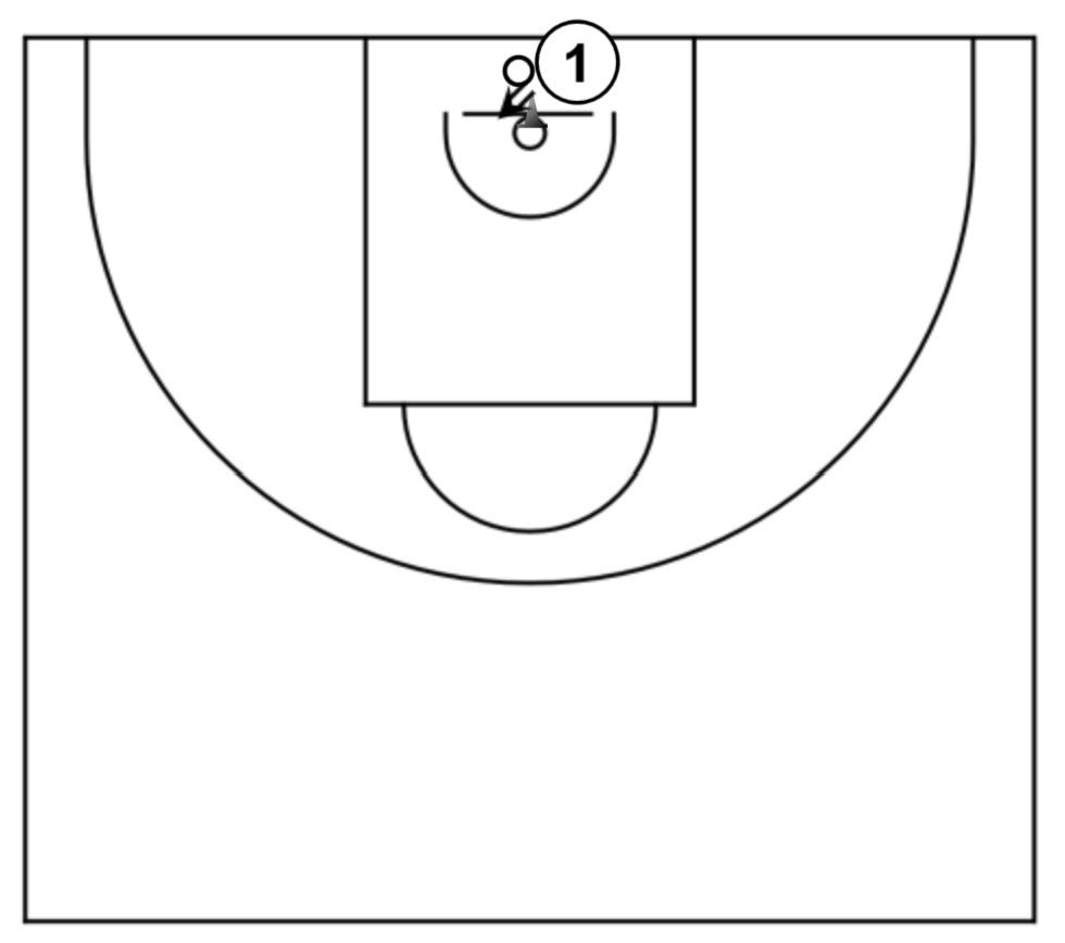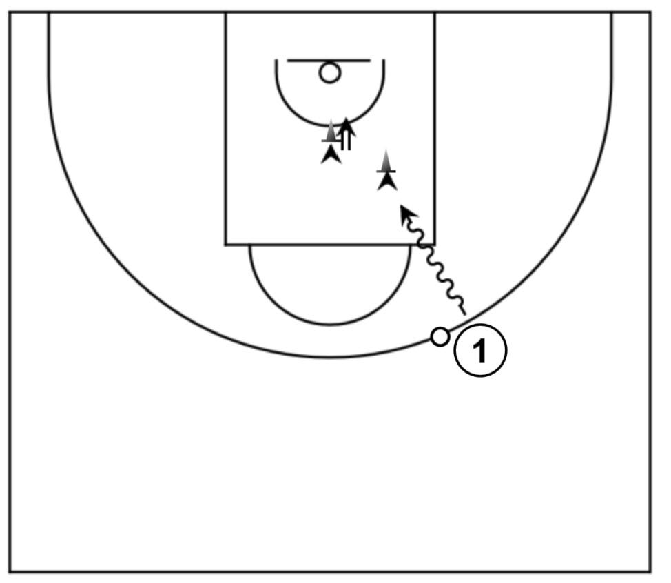 Sobre bote, entrada con un solo apoyo fintando aro pasado. Hacer la intención de finalizar a aro pasado con dos apoyos y cambiar de dirección en el primer apoyo para finalizar por el otro lado. Ejemplo: lado derecho; botar con mano izquierda, apoyo pie izquierdo y finalizar con mano derecha por el lado contrario dónde el jugador se dirigía. Implica cambiar de dirección en el apoyo. VARIANTE: cambiar el ángulo de la entrada.