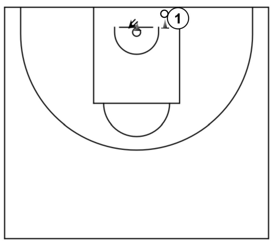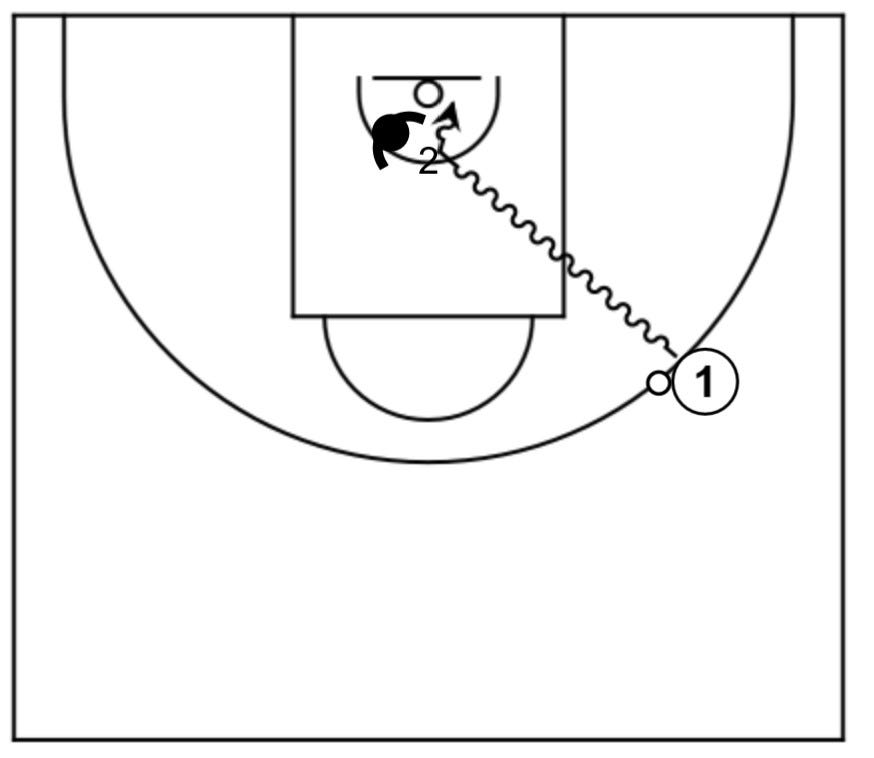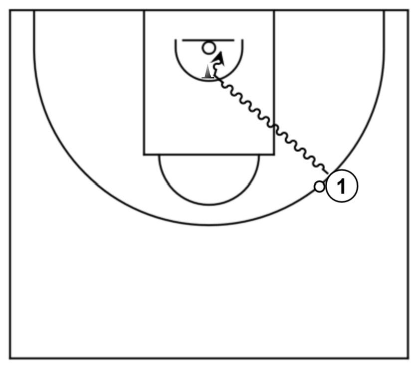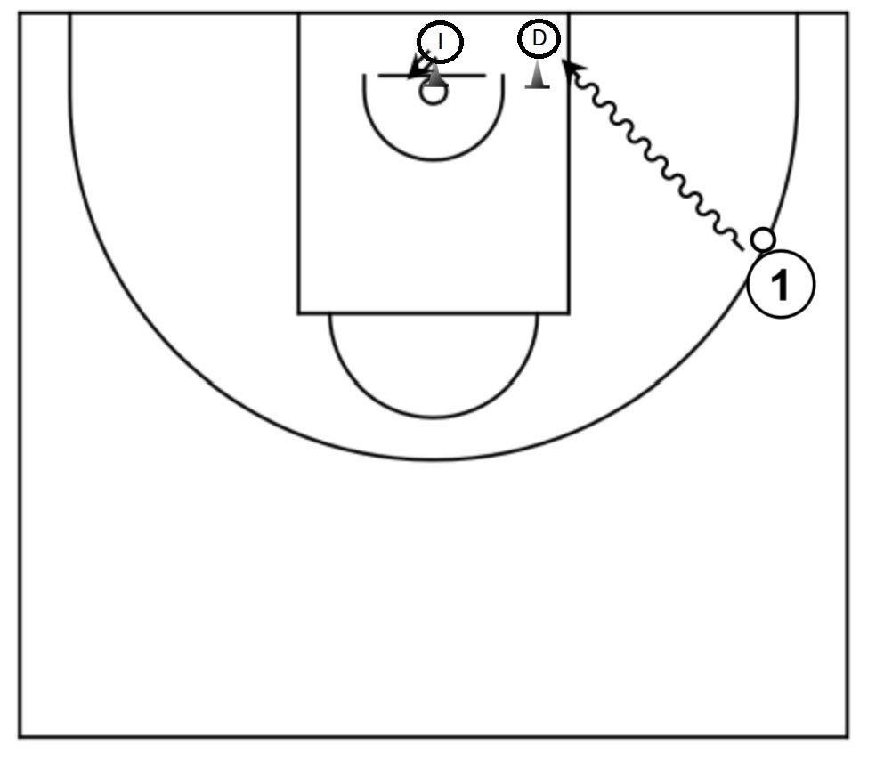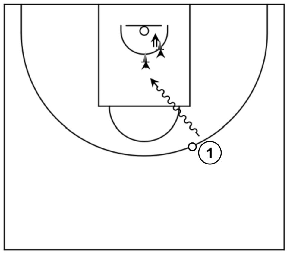 Sobre bote, entrada con un solo apoyo fintando aro pasado. Hacer la intención de finalizar a aro pasado con dos apoyos y cambiar de dirección en el primer apoyo para finalizar por el otro lado. Ejemplo: lado derecho; botar con mano izquierda, apoyo pie izquierdo y finalizar con mano derecha por el lado contrario dónde el jugador se dirigía. Implica cambiar de dirección en el apoyo. VARIANTE: cambiar el ángulo de la entrada.