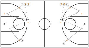 El defensor, cuando coge el rebote, pasa a la fila de atacantes.