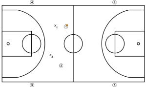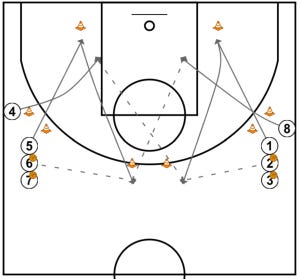 Añadimos puntuación a la tarea; gana el primer equipo que mete 4 puntos seguidos, sin recibir canasta entre medio. En el momento de la última canasta, todo el equipo, para que la victoria cuente, tiene que gritar: ¡¡¡VAMOS!!! Si no lo hacen, se sigue jugando.