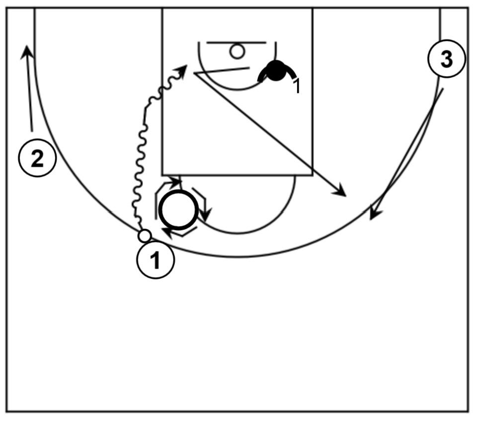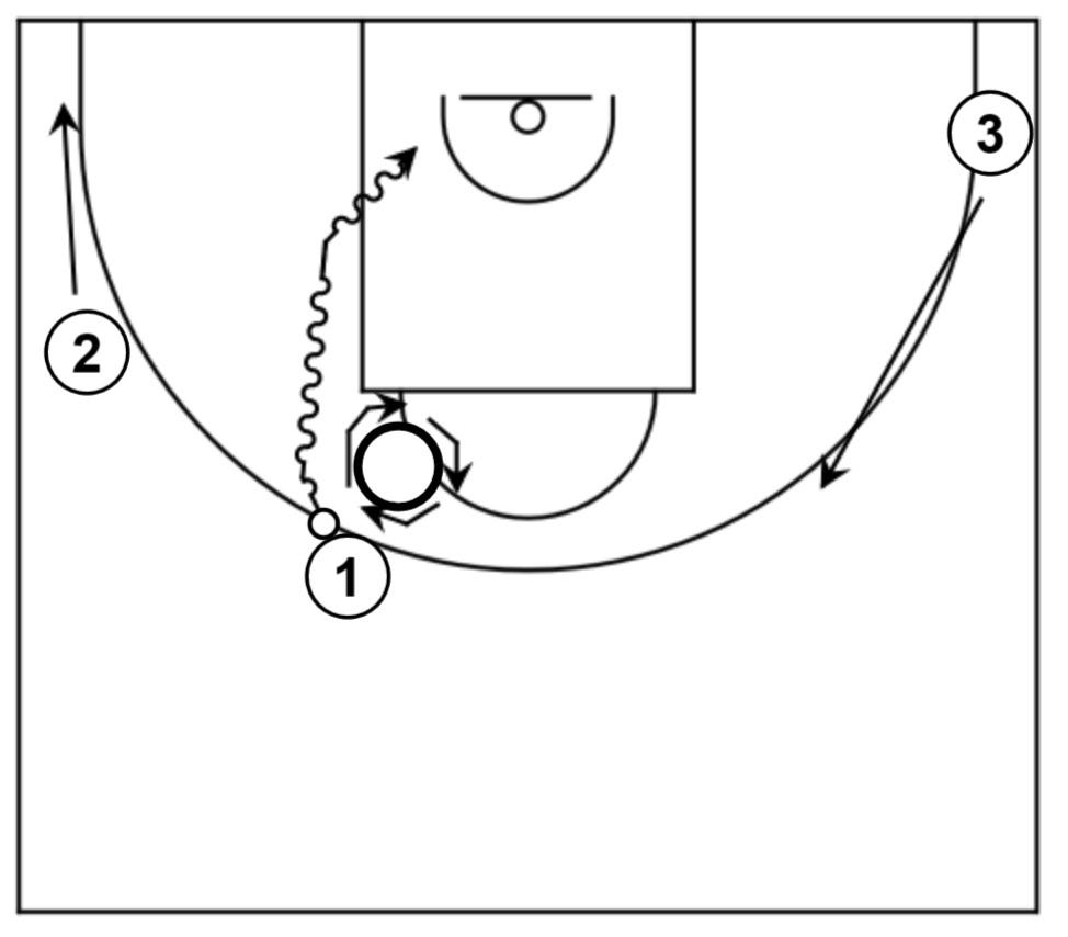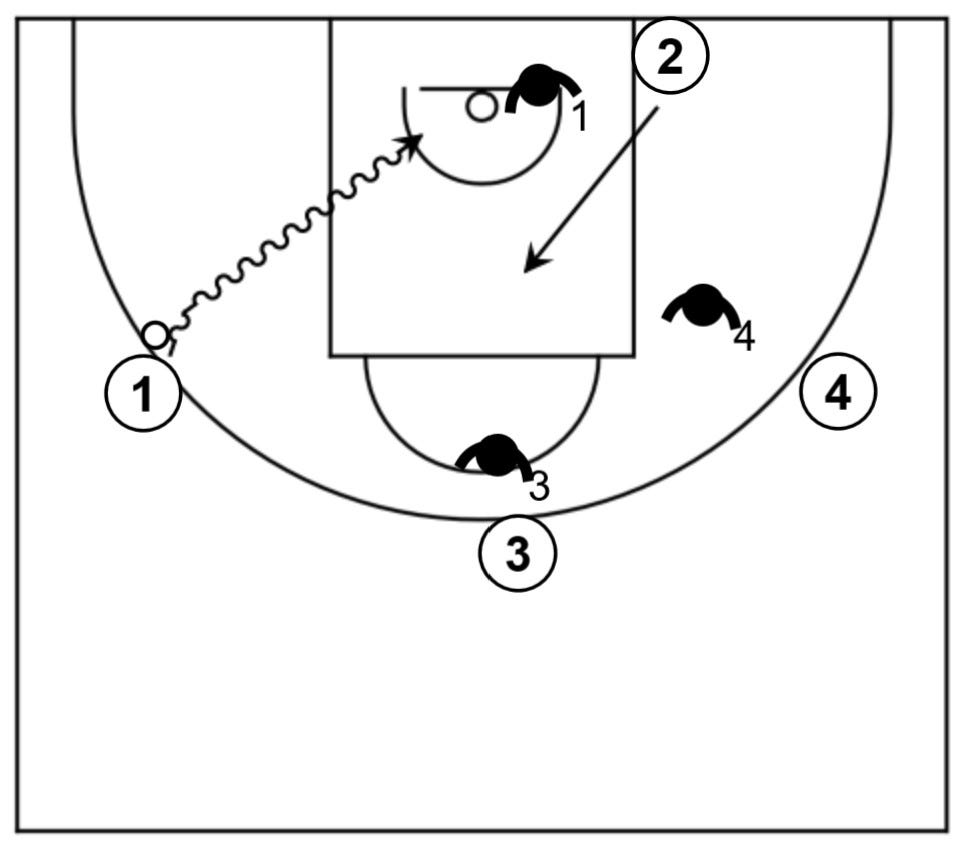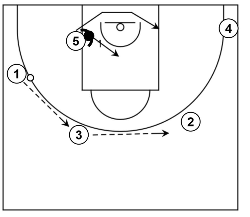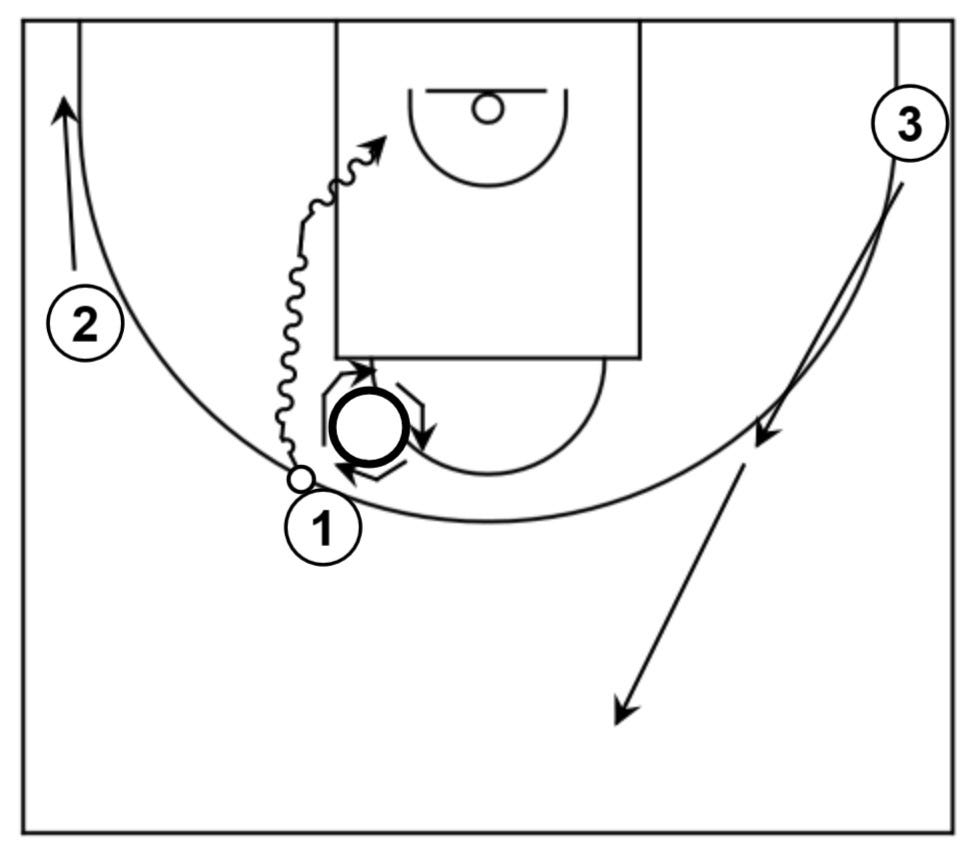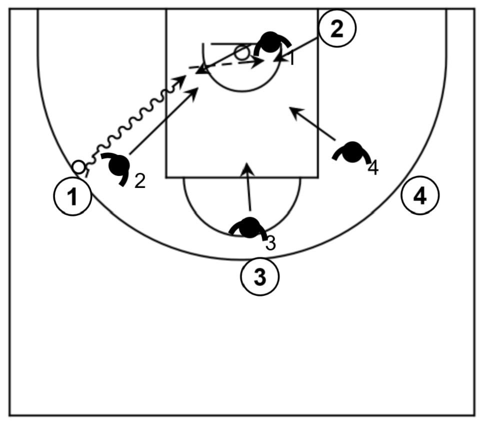 Mismo movimiento de anticírculo. El jugador interior intenta sellar a su defensor, pivotando y encarando balón, para evitar que pueda molestar la penetración y posicionarse entre defensor y aro por un posible rebote de ataque. En el caso de que su defensor consiga llegar al balón, se mueve al centro de la zona para alargar la recuperación.