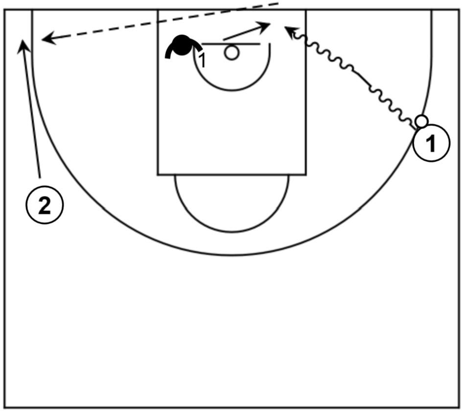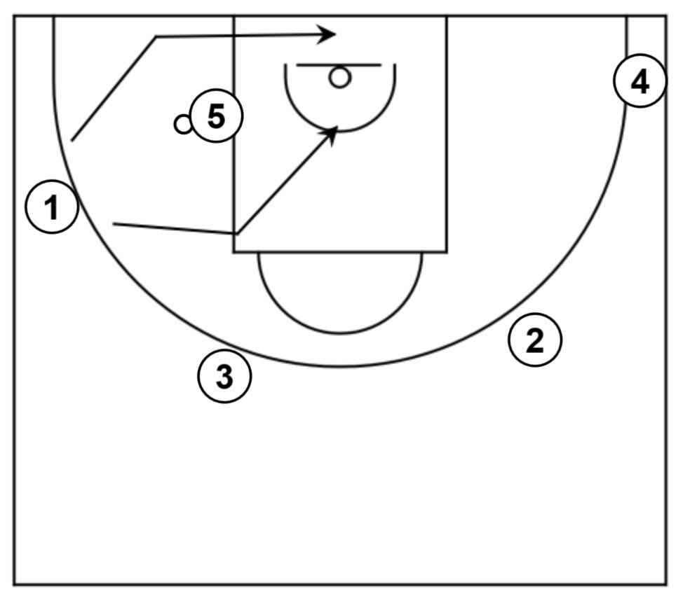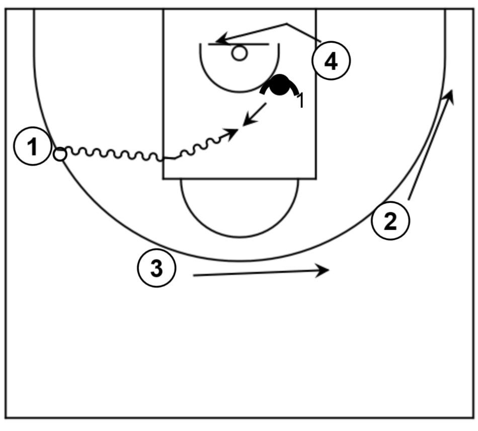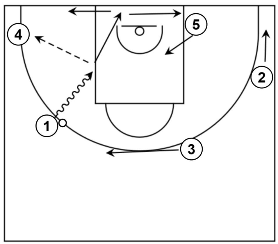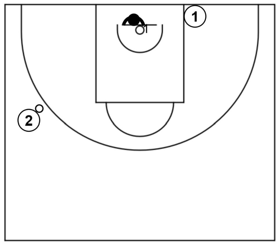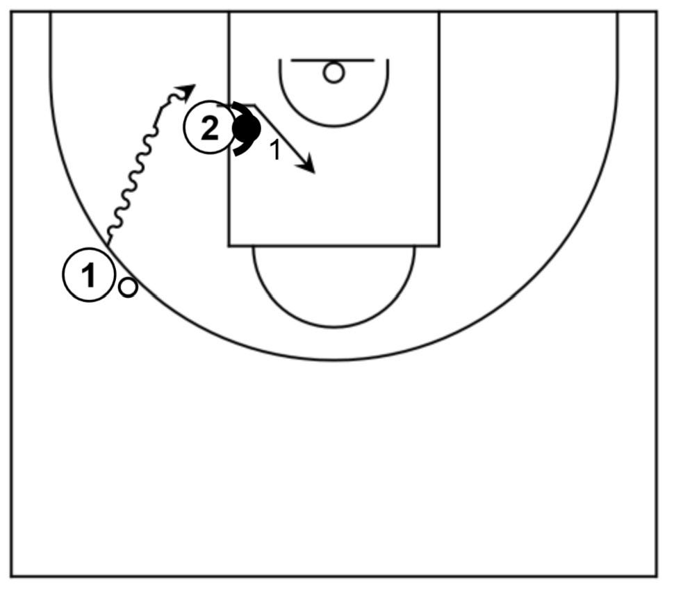 Mismo movimiento de anticírculo. El jugador interior intenta sellar a su defensor, pivotando y encarando balón, para evitar que pueda molestar la penetración y posicionarse entre defensor y aro por un posible rebote de ataque. En el caso de que su defensor consiga llegar al balón, se mueve al centro de la zona para alargar la recuperación.