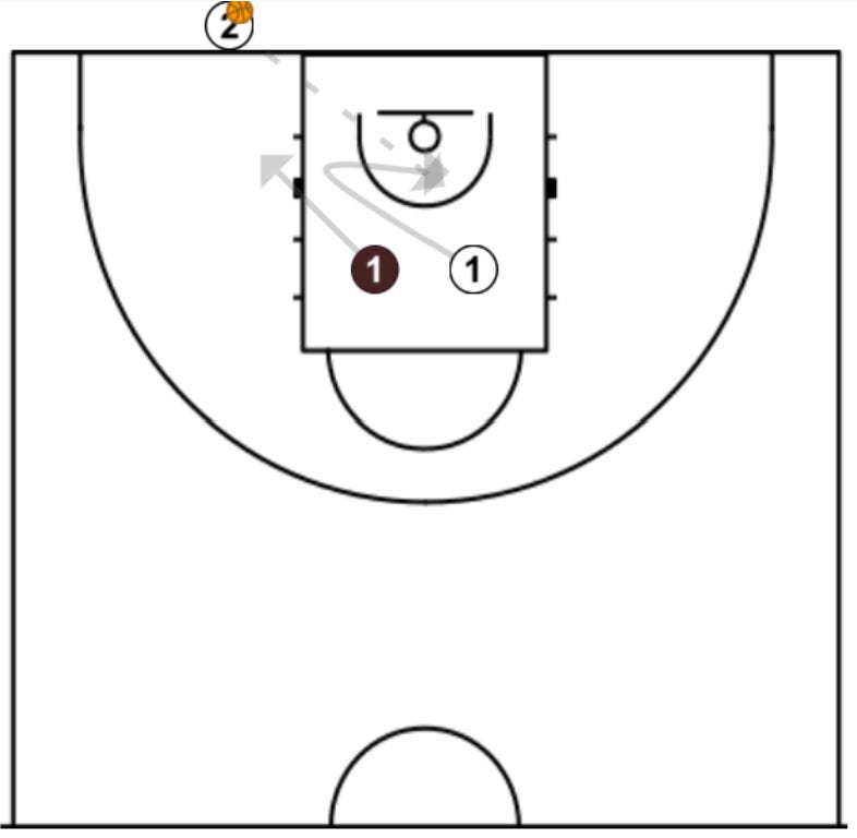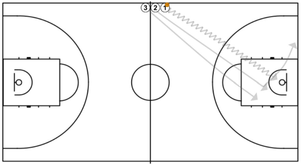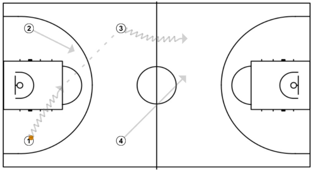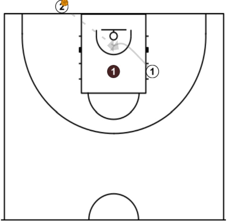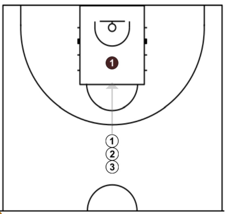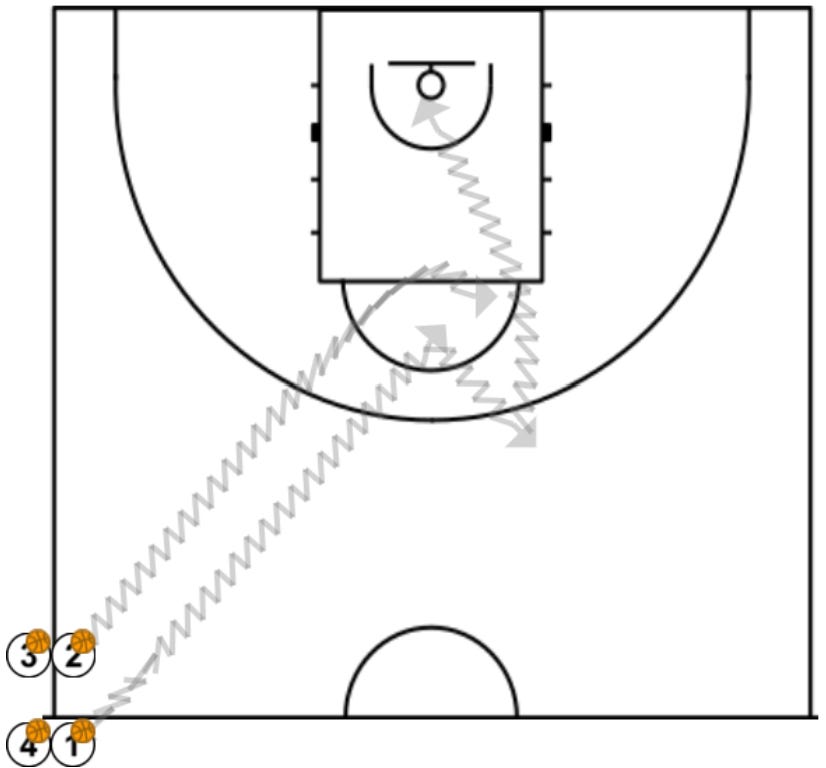 Recibir con parada en 1 tiempo mirando al pasador y pivotando para salir con el pie más próximo a canasta. Botar + finalizar.