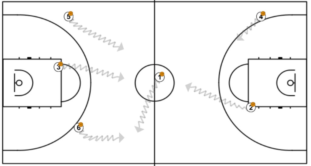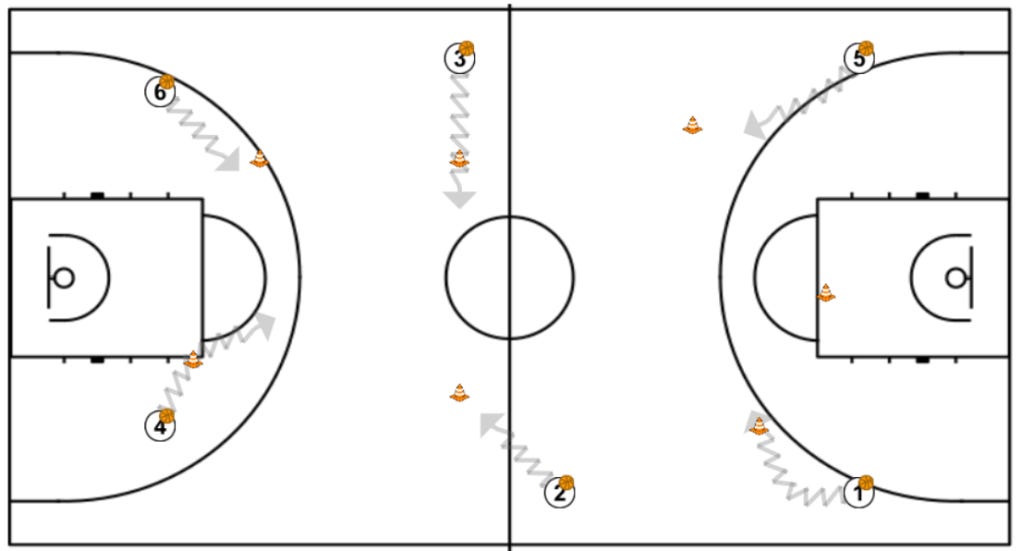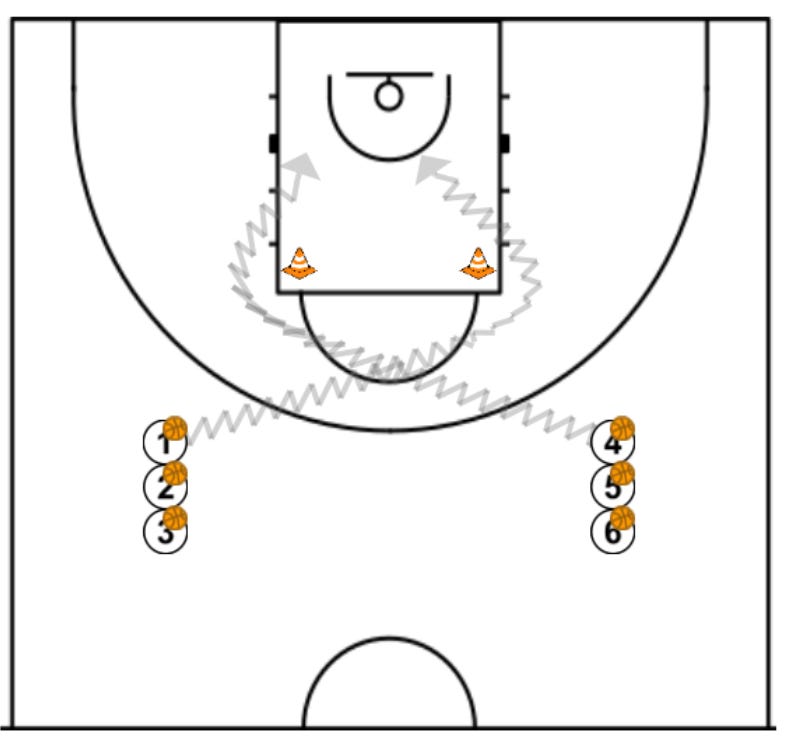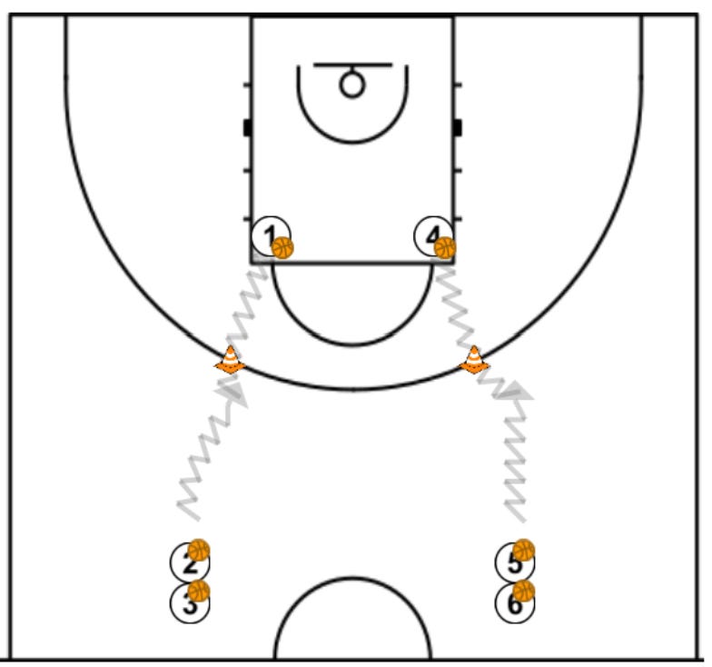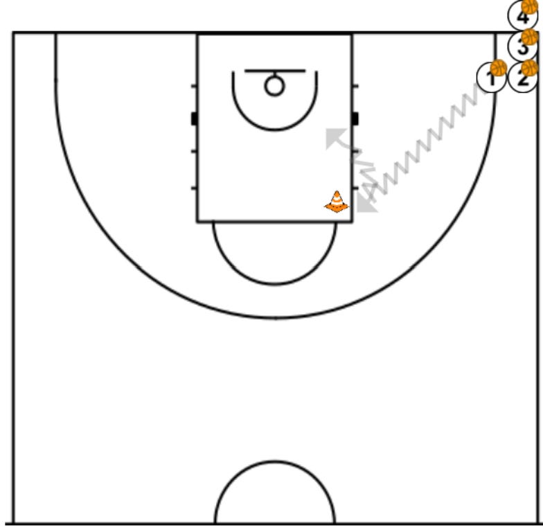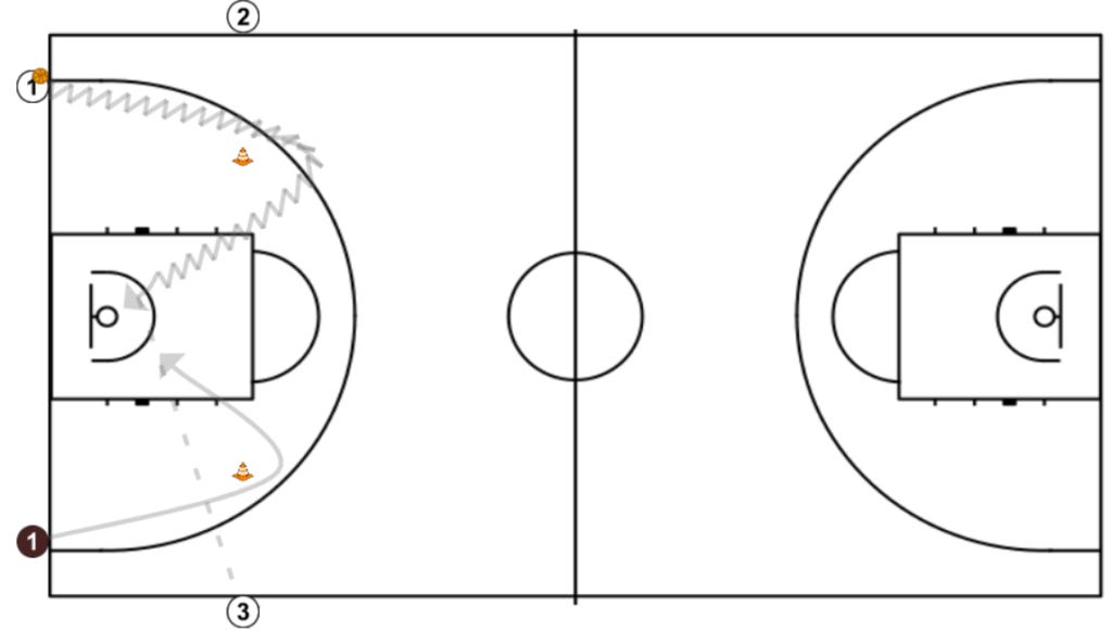 Salir hacia el cono y parar en 1 tiempo (sin dejar de botar), para cambiar de mano por detrás de la espalda y finalizar.