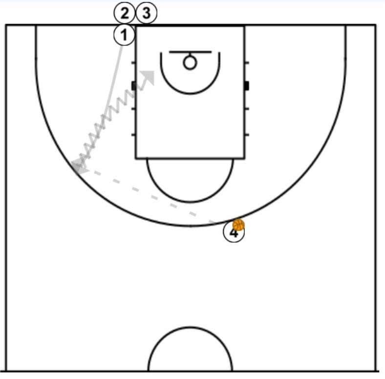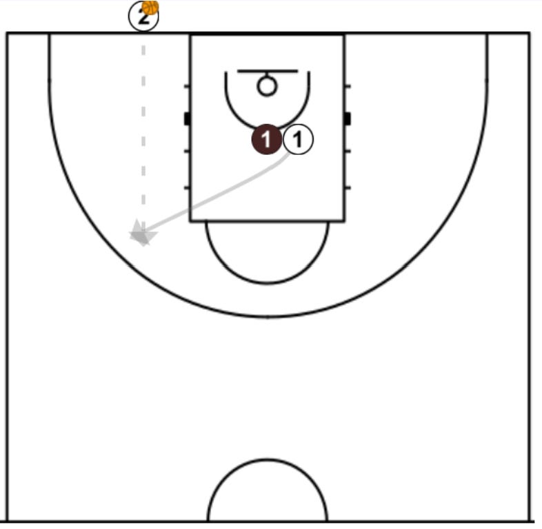 (1) ataca, (2) defiende. Se inicia cuando la atacante arranca. La atacante no puede anotar directamente, primero tiene que tocar la zona y, con un bote de retirada, salir fuera de la línea de 3 puntos.